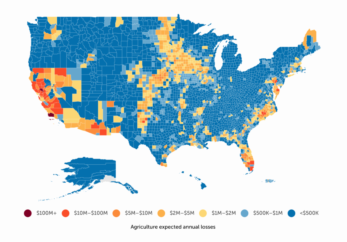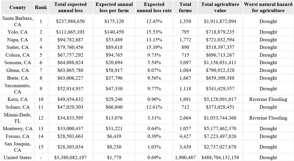At the county level, California continues to dominate the rankings, with Santa Barbara County reporting the largest expected losses at $238 million annually. Drought is the principal hazard here, impacting high-value crops like strawberries, vegetables, and wine grapes. Other California counties, such as Yolo, Napa, Sutter, and Colusa, also rank highly, with annual losses ranging from $68 million to $112 million. These counties experience some of the highest loss rates per farm, with those in Santa Barbara County and Yolo County losing an estimated $175,120 and $140,459 each year, respectively.